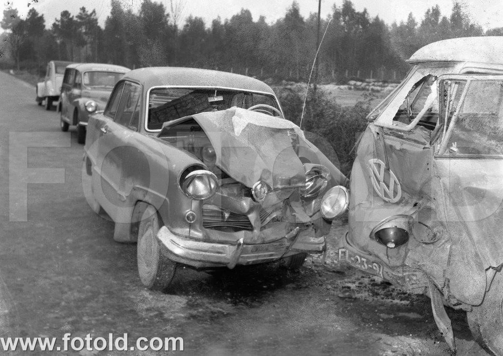 1960 Choque frontal entre uma Volkswagen Combi (pão de forma) e um Ford Taunus 12M.